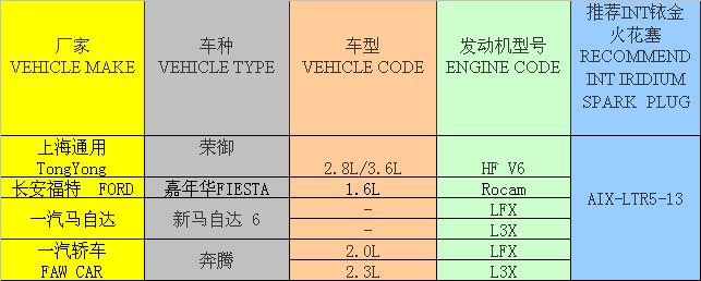 AIX-LTF5-11的參數(shù):銥金型火花塞,螺紋直徑:14MM,螺紋長度:25MM,六角對邊:16MM,熱值對應(yīng)NGK:5,帶電阻,間隙:1.3MM。
