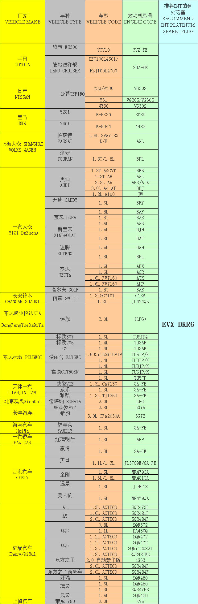 parameter of EVX-BKR6,Platinum,thread 14mm,reach 19mm (3/4"),hex size 16mm (5/8") , heat range 6, gap 1.1mm (0.44").